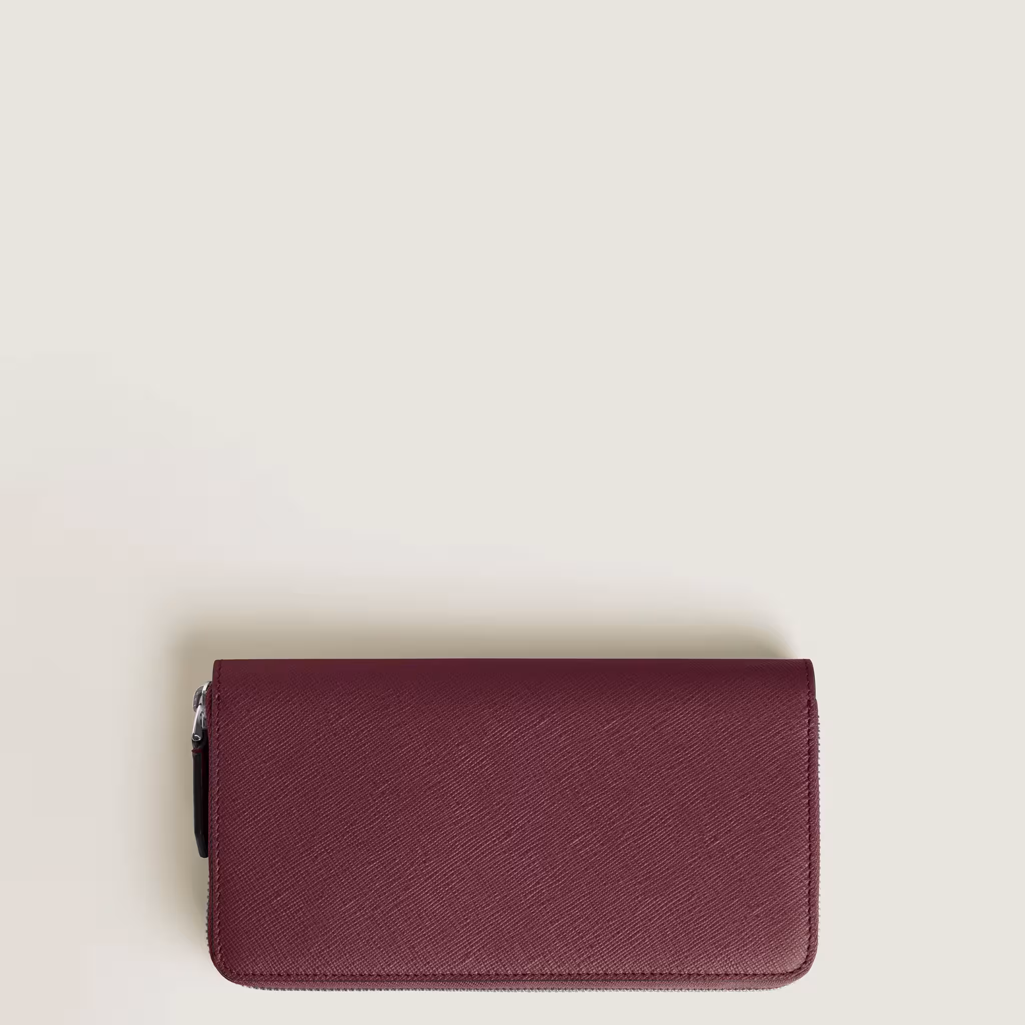 Un accessorio elegante e versatile. Questo portafoglio rettangolare Sartorial è la soluzione ideale per chi cerca uno stile unico e materiali affidabili. Oltre alle 12 fessure per carte di credito, presenta tre scomparti per banconote e un portamonete con cerniera. La pelle bovina pieno fiore con stampa Saffiano e il raffinato colore Cassis ne fanno un articolo esclusivo che unisce estetica, qualità e funzionalità.